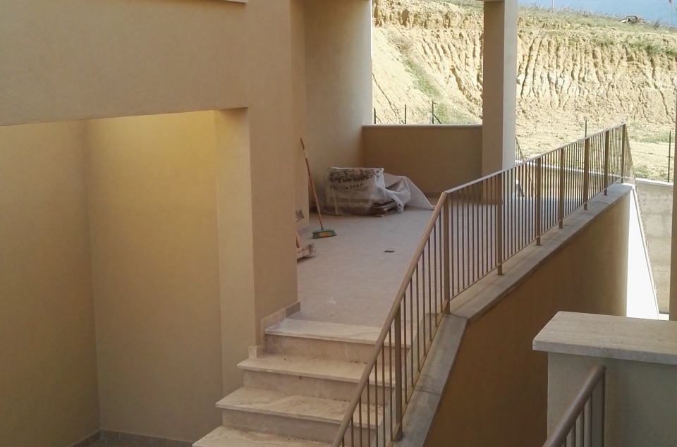 La struttura è realizzata in setti e pilastri in C.A., i solai sono in laterizio e C.A. tipo bausta, compreso quello inclinato di copertura. La fondazione è realizzata in travi rovesce in C.A. con integrazione di pareti sempre in C.A. a retta per la ripartizione delle differenti quote. I paramenti verticali esterni in laterizio con cappotto isolante termico esterno sono intonacati e tinteggiati con colori chiari, le cimase i davanzali, le soglie ed eventuali cornici in travertino. La copertura in tegole di laterizio con i canali di gronda ed i pluviali in rame, mentre tutte le ringhiere ed elementi di corredo sono realizzati in metallo verniciato grafite.