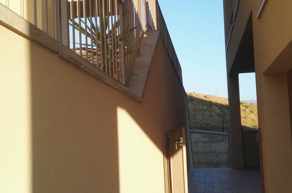 L’impianto è organizzato attorno a un piccolo vicolo-corte su due livelli dal quale si accede a quattro unità tipologiche contrapposte a coppie che si aprono sul vicolo mediante un porticato. Le quattro unità immobiliari di identica tipologia sono collocate in modo da seguire la pendenza del terreno. I dislivelli pur assecondando integralmente il declivio del terreno lo rendono armonico e graduale in modo tale che lo stesso non condizioni la sintesi linguistica necessaria per un complesso residenziale di queste modeste dimensioni, e soprattutto non incida sulla corretta fruizione e funzionalità delle unità residenziali.